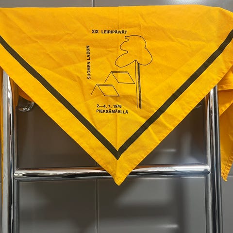Graafikko Kyösti Varis Hiihdon maailmanmestaruuskilpailut 1978 Hiihdon MM-kisat Lahti Ski Salpausselkä kaulahuivi kaulaliina mainostuote Salpausselän kisat vintage retro Suomi hiihdon maailmanmestaruuskilpailut 1978