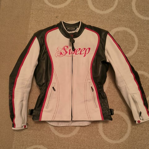 Sweep musta nahkainen ajotakki. Takki on käytetty joten näkyy käytönjälkiä. Mikä huomioitu hinnassa. Takki on ehjä. Hoidettu ennen ajokautta nahanhoitoaineella.