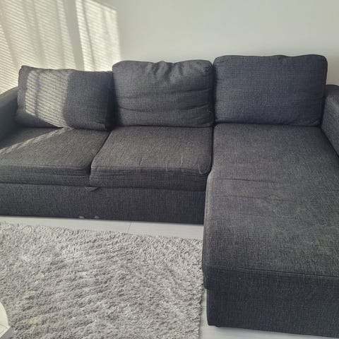 Divaanisohva. Lapsia ja eläimiä perheessä eli tahroja voipi olla. Rikki ei ole mistään. En tiedä merkkiä, ostin itsekin käytettynä. Divaanipuolen voi vaihtaa.
