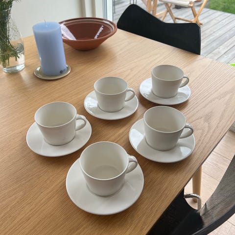 Iittala kahvikuppi ja aluslautanen, valkoinen posliini. Yhteensä kuusi kuppia ja kuusi aluslautasta.
