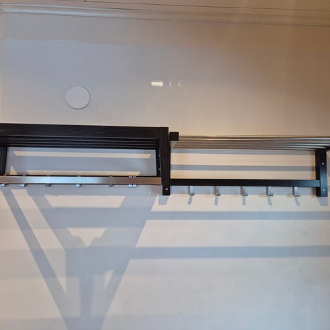Myydään n. 100cm leveä teräsrunkoinen hattuhylly siirrettävillä vaatekoukuilla.