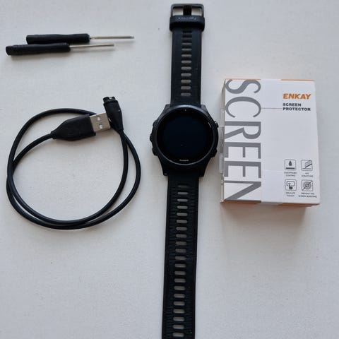 Kellossa on useita harjoitus- ja seurantatoimintoja, kuten juoksu- ja kuntoilutoiminnot sekä aktiivisuuden seuranta. Pakettiin kuuluu alkuperäinen myyntipakkaus, latauskaapeli ja ranneke.