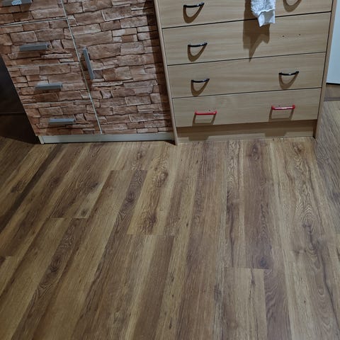 Malm-lipasto. Kahden laatikon välinen lista mennyt poikki, rako näkyy kuvassa. Aurinko muuttanut laatikoittain reunojen väriä kellertäväksi. Yleisilme kuitenkin siisti.