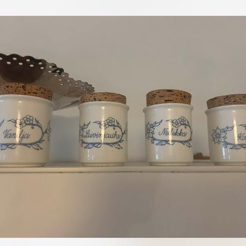 Arabia maustepurkit keramiikkaa korkkikansilla. Valkoiset purkit, joissa sininen koristekuvio ja tekstit eri mausteille. Sopivat mausteiden, yrttien tai pienten kuivatuotteiden säilytykseen keittiössä. Purkit ovat pöytämallisia ja uudelleentäytettäviä.