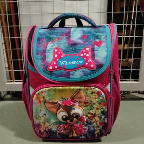 Myydään lasten koulureppu, 5€, repussa on kaksi taskua vettä/sateenvarjoa varten, nouto Vuosaaresta.