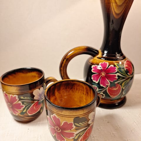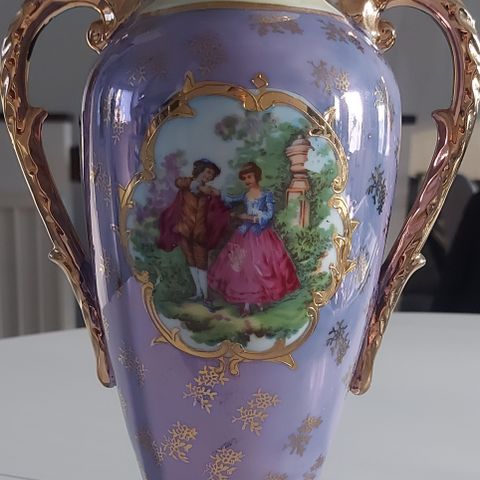Vaasi, jossa on koristeelliset kultaiset kahvat ja monivärinen kuviointi. Valmistettu Italiassa, ja siinä on Fragonardin inspiroima kuva-aihe.Rokokoo-tyylinen vaasi, joka heijastaa 1700-luvun eleganttia ja koristeellista muotoilua. Tyylille on ominaista runsaat koristeet ja pastellivärit.