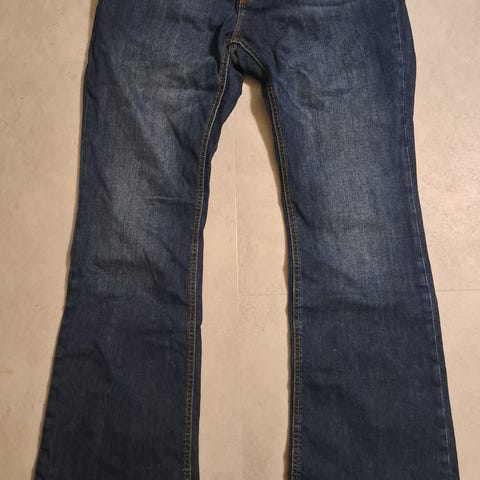 Korkeavyötäröiset farkut puuvilladenimistä, joissa on hiukan joustoa ja leveät lahkeet.