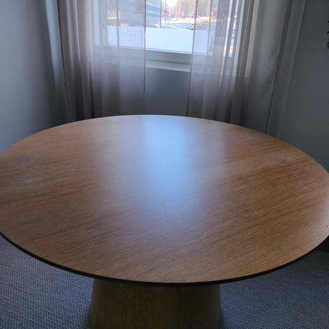 Valkoinen pyöreä Jyskin RINGSTED ruokapöytä, ostettu heinäkuussa 2025. Reunassa pieni lommo sekä pöytälevyssä muutama pieni jälki, niistä kuvat. Viimeisessä kuvassa näkyy millainen pöydän jalka on pohjasta, alta löytyy paino.