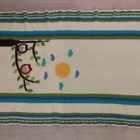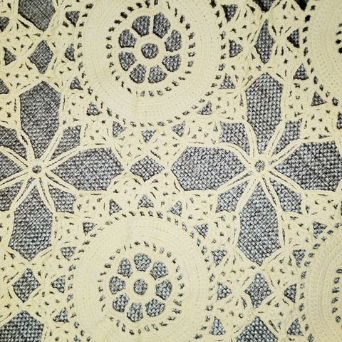 Kuvan pieni virkattu peitto vaikka nojatuolia koristamaan. Materiaalu vaikuttaa villalta.
