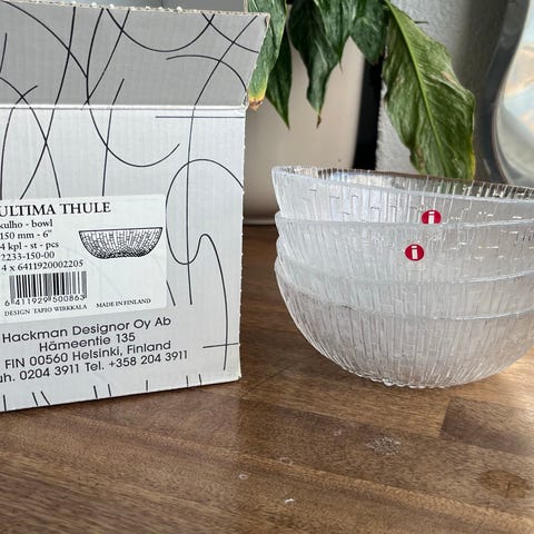 3 kpl Iittala Ultima Thule lasisia jälkiruokakulhoja, halkaisija noin 10cm. Lähes käyttämättömät.