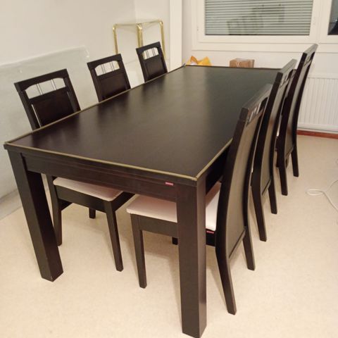 Täyspuiset tuolit ja pöytä seuraavaan kotiin. Kaikki ehjiä, jotain käytön jälkiä on, lakkaus kulunut muutaman tuolin selkänojan reunasta, mutta ei muuta mainittavaa. Tuolit leveähköt, eivät siroja. Pöydän koko 180x90. Oli ulkovarastossa viime kesänä ja sen jäljiltä vain likainen, ei siis tummunut tai homeessa. Pesu jää seuraavalle omistajalle. Pöytä valmiiksi osissa.