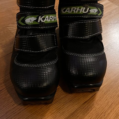 Karhu lasten hiihtomonot. Mustat monot, joissa keltainen Karhu-logo ja kaksi tarranauhastrappia jalan tukemiseen ja helppoon pukemiseen. Pohjassa perinteisen hiihtomonon uritus ja kiinnitys järjestelmää varten. Soveltuvat lasten maastohiihtoon. Koko 32