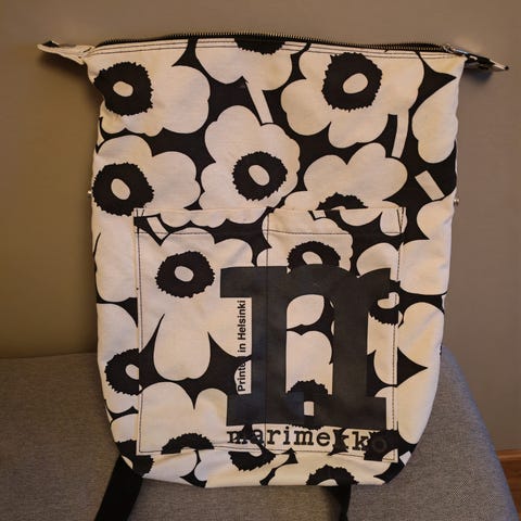 Myydään Marimekon yksiolkaiminen reppu. Koko n. 25x37 cm. Hyvässä kunnossa, etuosassa tasku, marimekko logo selkäpuolella.