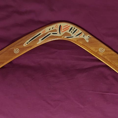 Myynnissä 'vintage' puinen koristeltu bumerangi, ei lakattu