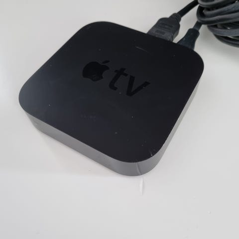 Apple TV mediasoitin musta. Mukana virtajohto ja kaukosäädin. Laitteessa HDMI-liitäntä televisioon kytkemistä varten sekä verkkoliitäntä. Soveltuu suoratoistopalveluiden ja muun mediasisällön toistamiseen yhteensopivan television kanssa.