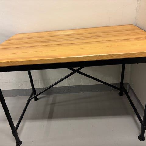 IKEA Kullaberg työpöytä. Pöydässä on yksinkertainen metallinen runkorakenne poikkituilla, mikä lisää tukevuutta. Sopii esimerkiksi työpöydäksi, ruokapöydäksi tai sivupöydäksi kotiin tai toimistoon. Pöytätaso on luonnonväristä puuta.