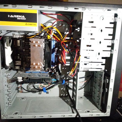 Acer pöytätietokone musta. Perinteinen tornimallinen kotelo, jossa etupaneelissa USB-liitännät ja ääniliitännät. Kotelossa on tarroja ja punaisia yksityiskohtia. Käyttöjärjestelmänä näkyy Windows, ja koneen laitetiedot ovat nähtävissä kuvissa. Sopii yleiskäyttöön