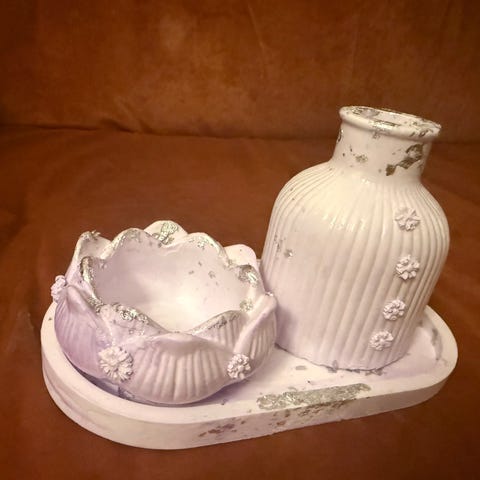 Myydään kaunis, käsintehty sisustussetti, joka on valmistettu kipsistä. Setti on koristeltu tyylikkäillä kultaisilla yksityiskohdilla (lehtikulta-efekti), mikä antaa sille ylellisen ilmeen.