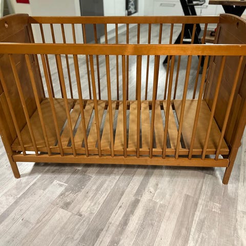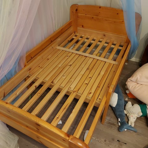 Annetaan jatkettava lastensänky. Jonkun verran käytönjälkiä, mutta edelleen käyttökuntoinen