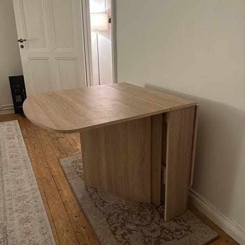 Pöytä sopiva juuri neljälle ja se on päällystetty punaisella linoleumilla.