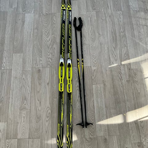 Maastohiihtosukset ja sauvat. Sukset ovat mustat ja niissä on siteet valmiina. Mukana tulee pari hiihtosauvoja, 150cm. Sopii perinteiseen maastohiihtoon. Tarkemmat mitat, pituus ja muut tekniset tiedot eivät käy ilmi kuvista. Sukset on karvapohjaiset.