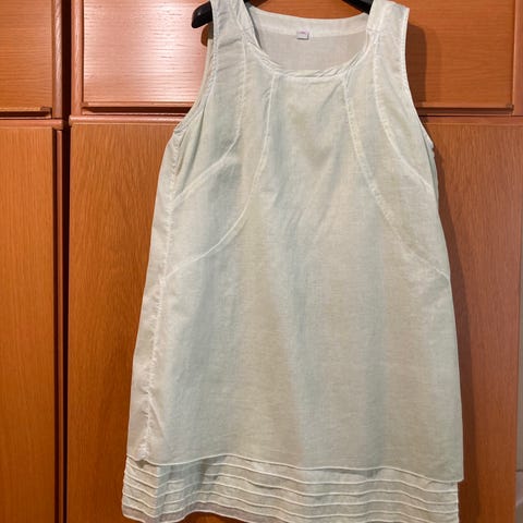 Mekossa vyötärölle solmittava nauha, joka luo rypytystä ja muotoa yläosaan. Pituus polven ylä- tai tuntumaan. Sopii kesäkäyttöön arkeen ja juhlaan.
