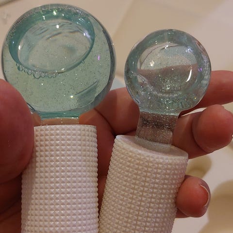 Lasiset Dermalogica kasvojen turvotukseen poistoon tarkoitetut pyöreäpäiset sauvat. Säilytä pakastimessa tai jääkaapissa, jotta ovat aina käyttövalmiit. Pyörittele kuulapäitä hoitoa tarvitsevista kohdissa. Voit myös käyttää hoitotuotteiden levittämisen yhteydessä. Ei alkuperäispakkausta.