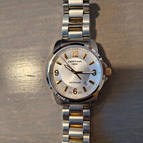Certina on todella laadukas merkki, tässä nyt halvalla tämä malli vähäisen käytön vuoksi, kellon oikea koko 38mm muistaakseni, nyt paljon pienempi kun omaan ranteeseen laitettu , kelloo käytetty vähän aikaa. Kellon oma boksi, ja takuukortti mukaan, myös lisäpalat jotta saapi omaan käteen sopivaksi!!