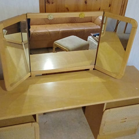 Kuvissa mitat. Ok kuntoinen pöytä. Vain nouto uuraisilta. Pöydänkansi ehjä jotain tahroja laatikoissa mikä kuulunee asiaan.