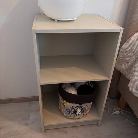 Yöpöydän päällä takaosassa kuvan mukainen pieni lohkeama. Mukaan mustat kangas"laatikot"