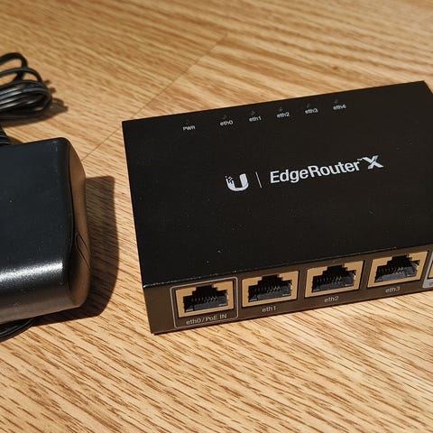 Ubiquiti ER-X reititin, ja sen kanssa käytössä ollut PoE-injektori 24V/0.5A POE-24-12W-G. Myös tavallinen 5V/1A verkkovirtalähde mukaan.