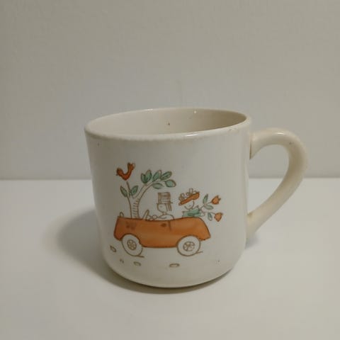 Myydään vanha, yli 60 v, Arabian lasten muki, pohjassa merkinnät: Arabia, made in Finland, 2-67. Kahva aikoinaan irronnut ja liimattu, muuten ehjä, pientä poreilua lasitteen alla, mutta lasite ehjä.