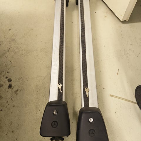 Mercedes-Benz A2138900793 kattotelineet. Alumiinirunkoiset poikittaiskiskot, joissa muoviset päädyt ja lukitusmekanismi. Sopivat auton kattokaiteisiin kiinnitettäviksi. Telineet soveltuvat esimerkiksi kuljetuslaatikoiden, suksiboksien tai muiden kattovarusteiden kiinnittämiseen. Tarkempi yhteensopivuus kannattaa varmistaa osanumeron A2138900793 perusteella auton mallin ja vuosimallin mukaan.