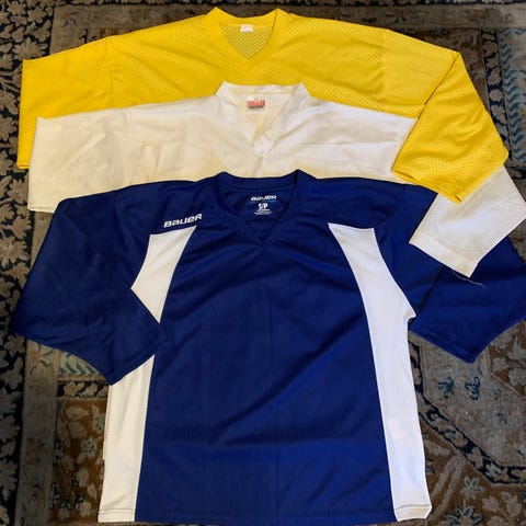 Uusia, muoveissa olevia jääkiekko harjoituspaitoja. Koko L