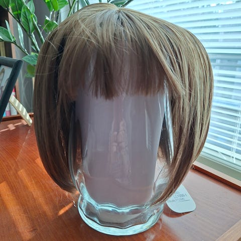 Uusi, laput vielä kiinni, käyttämätön peruukki. Häiveotsa, luonnollinen hiusraja sekä monofilamentti.