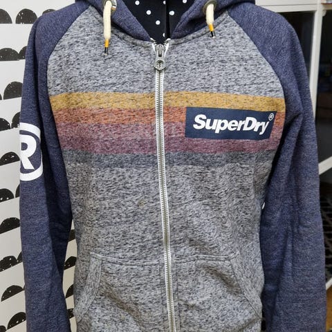 Hupussa kiristysnyörit ja edessä kengurutasku. Ribbiresorit hihansuissa ja helmassa. Useita Superdry-logomerkintöjä hihassa ja sisäpuolella. Soveltuu arkikäyttöön ja kerrospukeutumiseen.