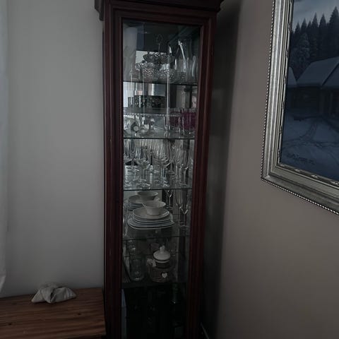 Iso kirjahylly kokonaisuus vitriinillä, vitriinissä valot. Tarvittaessa voin koittaa mitata, menee osiin kuljetuksen ajaksi.