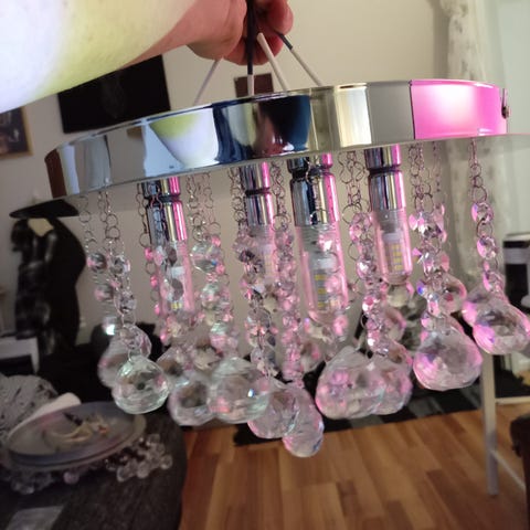 Kuvassa on LampGustaf-merkin kristalliplafondi, joka on tyyliltään moderni kattokruunu.