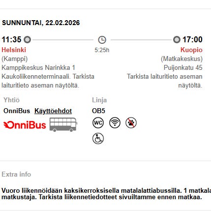 Lähtö Kuopion Matkakeskuksesta klo 9.35. Perillä Helsingissä Kampin terminaalissa klo 15.