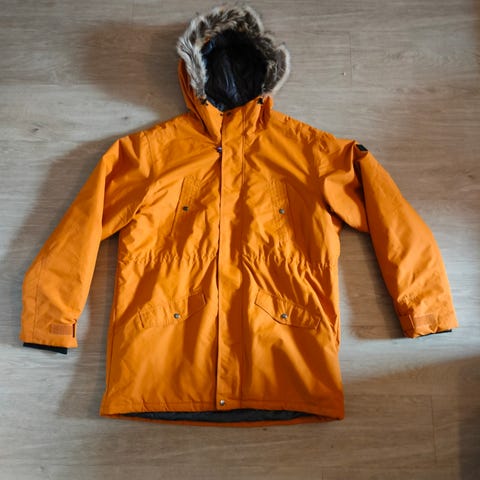 Kevyt ja konepestävä. Paljon taskuja. Vetoketju aukeaa molemmista päistä. Syvä huppu.
