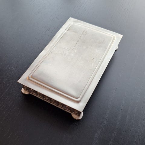 Vanha tupakkarasia 50-luvulta! Rasiassa on nimikirjaimet J.P. ja teksti 50v.
