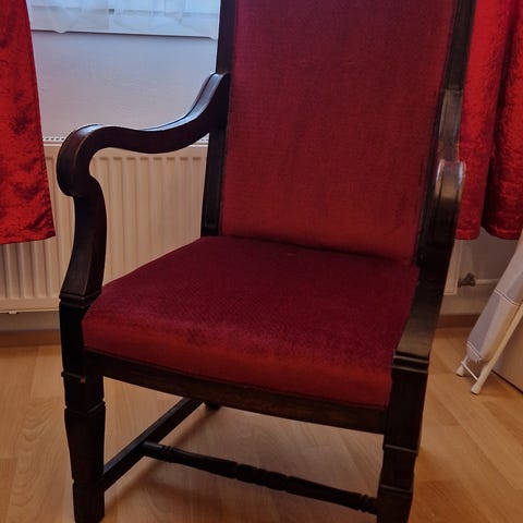Hakusanat: verhoilu, huonekalut, klassinen, niskatyyny, puukäsinojat, Tuoli, mukava, tuolit, käytetyt huonekalut, vintage, vintage huonekalut, retro, korkea selkänoja, istuin, tummat käsinojat, sisustus, nojatuoli, nojatuolit, lepotuoli, valkoinen, huonekalu