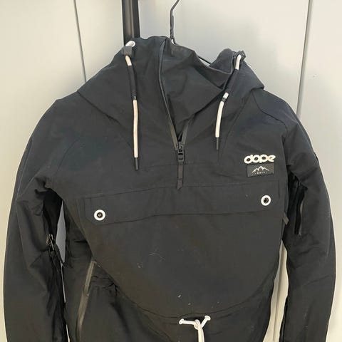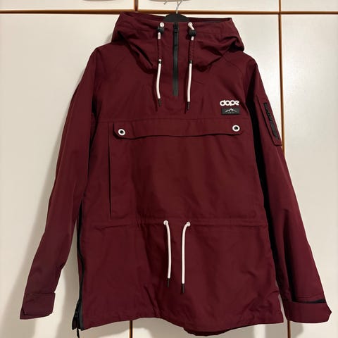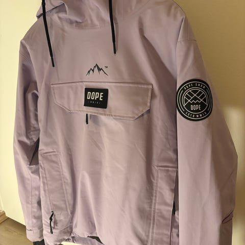 Dope anorakkitakki hupulla, väri vaaleanpunainen. Takissa on etupuolella suuri läpällinen tasku ja vetoketjut sivuilla pukemisen helpottamiseksi. Hupussa on kiristysnyörit ja edessä lyhyt vetoketju tuuletusta varten. Hihoissa on tarrakiristykset ja vasemmassa hihassa pieni vetoketjutasku. Sopii ulkoiluun ja lasketteluun tai muuhun vapaa-ajan käyttöön. Kunto hyvä.