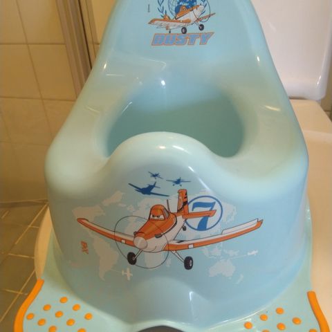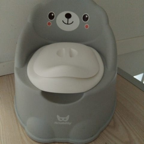 Käyttämätön herobilityn virtahepo potta. Rengas ja astia lähtevät pois helppoa pesua varten. Kansi ”naksahtaa” yläasennossa auki, eikä kaadu siitä lapsen päälle kun hän istuu. Sivuissa pienet kahvat kantamista varten.