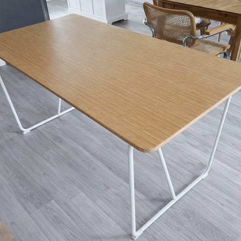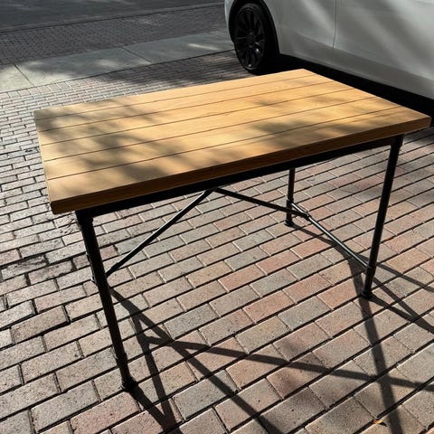 IKEA pöytä, jossa suorakulmainen puukansi ja mustat metallijalat. Kansi on vaaleaa puuta, jossa näkyvä puunsyykuvio. Runko koostuu putkimaisista metallijaloista ja poikittaisista tukirakenteista, jotka lisäävät pöydän tukevuutta. Sopii esimerkiksi työpöydäksi, sivupöydäksi tai pieneksi ruokapöydäksi erilaisiin tiloihin. Ainoastaan nouto ja käteiskaupat.