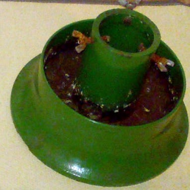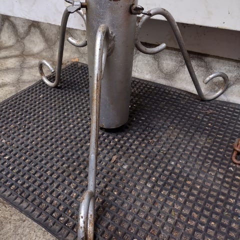 Ehjä, tukeva metallinen jalka joulukuuselle, joka pysyy pystyssä aivan asiallisesti. Se on n. 17 cm korkea, n. 24 cm pyöreän osan läpimitta. Valmistajasta ei ole tietoa. Sen saa hakea 6 eurolla.