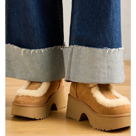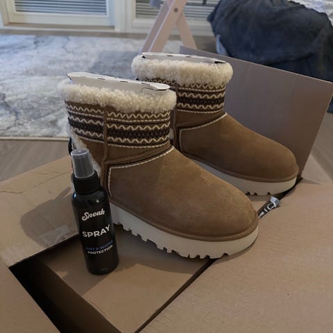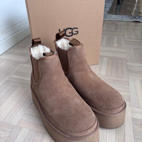 UGG talvikengät, koko 39. Ruskeat värissä chestnut. Nilkkapituiset kengät paksulla pohjalla. Päällinen mokkanahkaa ja sisäpuoli on pehmeää, vaaleaa villavuorta. Kengissä on vetolenkki kantapäässä ja kuminen ulkopohja. Soveltuvat kylmään säähän ja arkikäyttöön. Kunto on hyvä, mutta mokasta näkee, että kenkiä on käytetty ja hieman harjattu. Käyttö näkyy erityisesti vasemmassa kengässä olevasta vaaleammasta kohdasta. Kokonaisuus on kuitenkin siiti ja kengät ovat oikein hyvässä kunnossa!
