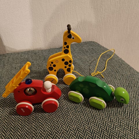 Neljä puulelua vauvalle. 3 kpl Brio-merkkisiä ja auto on jokin muu puulelu. Ehjiä ja aina säiluäytetty sisällä. Uudehko omakotitalo eli puhtaita ja hajuttomia.