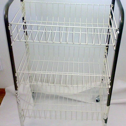 Metallisen hyllykön valmistajasta ei ole tietoa. Sen koko on 183 cm korkeus, 61,5 cm leveys, 38 cm pituus. Siinä näkyy joitain käytön jälkiä mutta sopii varmaan monenlaiseen säilytykseen. Sen saa hakea 3 eurolla.