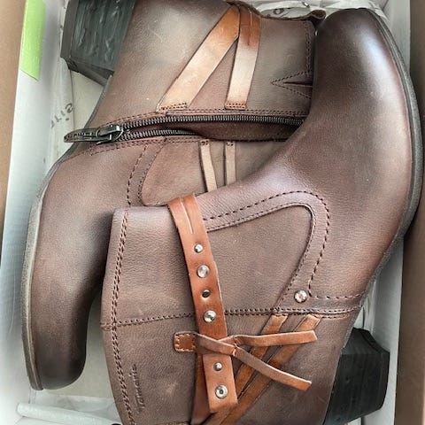Jonkunverran käytetty, kantalaput hieman kuluneet mutta pinta siisti. Materiaalista en osaa sanoa, mokkamainen pinta kuitenkin.